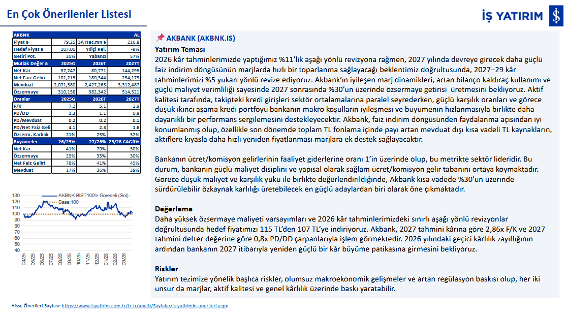 Akbank, İş Yatırım'ın Nisan 2026 raporunda AL tavsiyesiyle öne çıkan ve hedef fiyatı 107 TL'den 115.80 TL'ye revize edilen bankalar arasında yer alıyor. Mevcut fiyat 79.25 TL ile hedef fiyata göre %35 getiri potansiyeli taşıyan hisse, 2026 tahmini 5.1x F/K ve 1.1x PD/DD çarpanlarıyla işlem görmeye devam ediyor. Bankanın 2025 yılında 57.2 milyar TL olan net kârının 2026'da 80.8 milyar TL'ye, 2027'de ise 144.3 milyar TL'ye ulaşması bekleniyor.