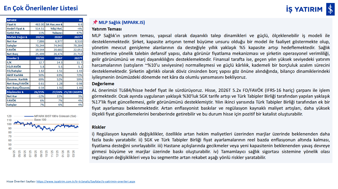 Şirket için 514 TL hedef fiyat ile AL önerisi korunmaktadır. Hisse 2026 tahmini 5,2x FD/FAVÖK çarpanı ile işlem görmektedir. SGK ve Türk Tabipler Birliği tarafından yapılan fiyat artışları gelirleri desteklerken, yılın ikinci yarısında ek fiyat güncellemeleri beklenmektedir. Enflasyon ve maliyet baskılarının daha yüksek ölçekli fiyat artışlarını tetikleyebilmesi hisse için potansiyel bir katalist olarak öne çıkmaktadır. Riskler tarafında ise regülasyon kaynaklı değişikliklerin özellikle hekim maliyetleri üzerinden marjları baskılaması, fiyat artışlarının enflasyonun altında kalması, hastane açılışlarının gecikmesi veya kapasite artışının yavaş ilerlemesi ve tamamlayıcı sağlık sigortası tarafında artan rekabet ya da olası düzenlemeler öne çıkan başlıca risk unsurlarıdır.