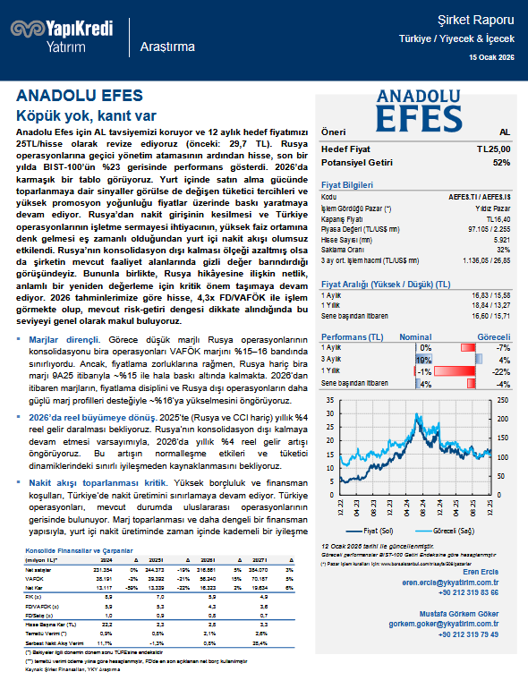 Anadolu Efes için AL tavsiyemizi koruyor ve 12 aylık hedef fiyatımızı 25TL/hisse olarak revize ediyoruz (önceki: 29,7 TL).