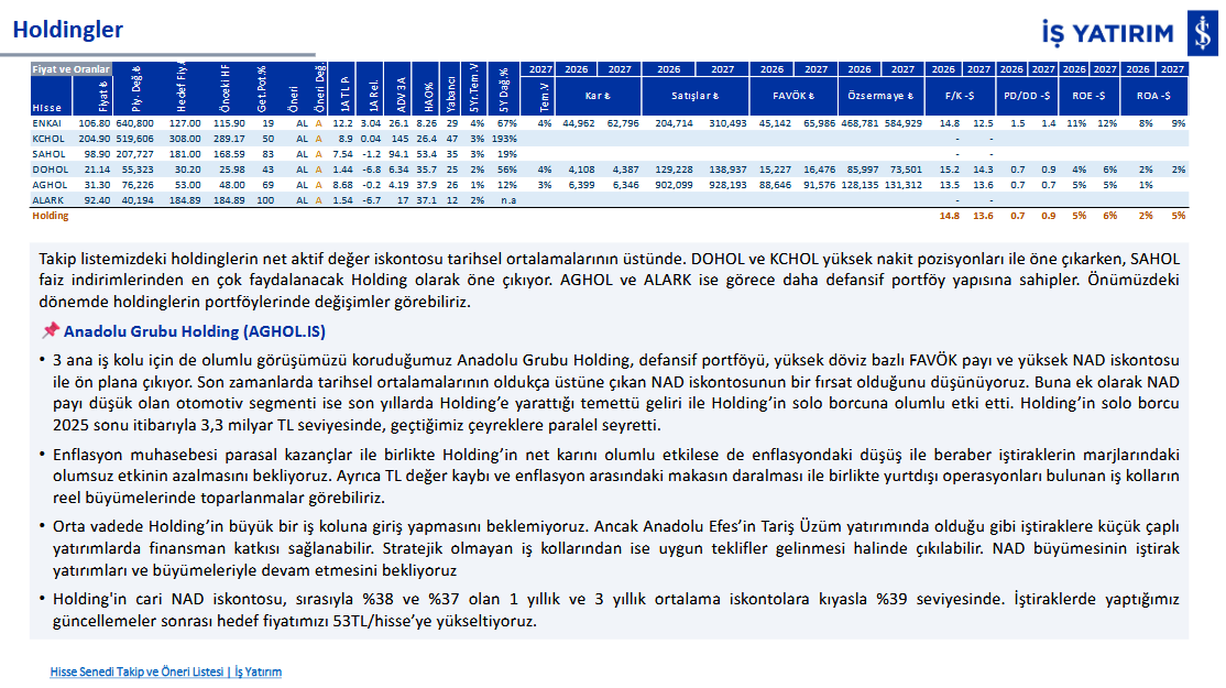 AG Anadolu Grubu Holding (AGHOL) için İş Yatırım’ın raporunda 12 aylık hedef fiyatı 53,00 TL olarak belirlenmiş ve hisse için “AL” tavsiyesi verilmiştir. Holding; defansif portföy yapısı, yüksek döviz bazlı FAVÖK payı ve güncel olarak %39 seviyesindeki Net Aktif Değer (NAD) iskontosu ile öne çıkmaktadır. NAD iskontosunun tarihsel ortalamalarının oldukça üzerinde olması, mevcut seviyelerden hisse için bir fırsat sunmakta.