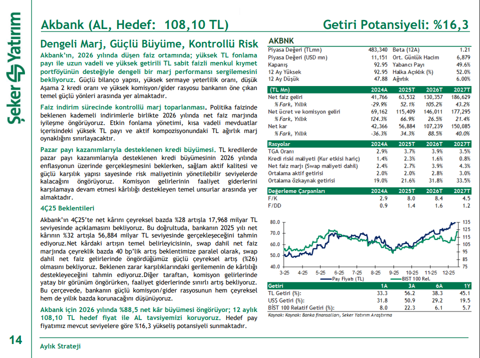 Akbank’ın 2026 yılında düşen faiz ortamında, yüksek TL fonlama payı ve uzun vadeli, yüksek getirili TL sabit faizli menkul kıymet portföyü sayesinde net faiz marjını dengeli bir şekilde koruması bekleniyor. Güçlü bilanço yapısı, yüksek sermaye yeterlilik oranı, düşük Aşama 2 kredi oranı ve güçlü komisyon/gider dengesi bankanın temel güçlü yönleri olarak öne çıkıyor.