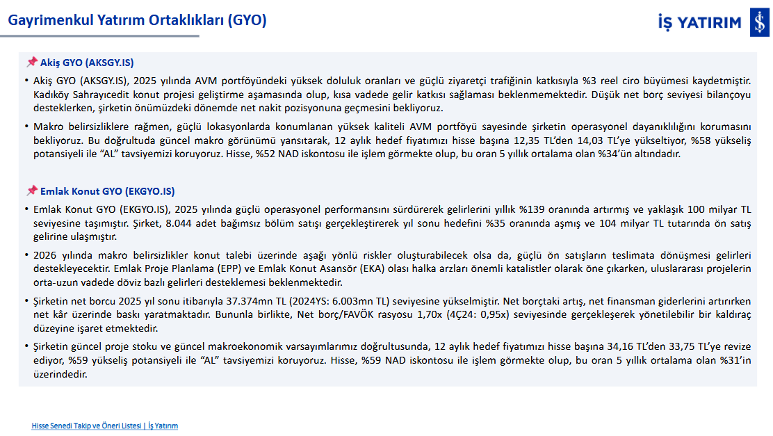 Akiş GYO (AKSGY) için İş Yatırım’ın raporunda belirlenen hedef fiyat 14,03 TL olup, hisse için tavsiye “AL” şeklindedir. Şirketin güçlü yönleri olarak, AVM portföyündeki yüksek doluluk oranları ve güçlü ziyaretçi trafiği sayesinde 2025 yılında reel bazda %3 ciro büyümesi sağladığı belirtilmiştir. Kadıköy Sahrayıcedit konut projesi geliştirme aşamasındadır ve kısa vadede gelir yaratması beklenmemektedir. Ayrıca, şirketin düşük net borç seviyesi bilanço açısından güçlü bir pozisyon sunmakta ve önümüzdeki dönemde net nakit pozisyonuna geçmesi öngörülmektedir.