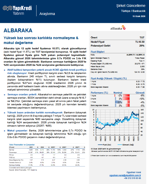 Albaraka için 12 aylık hedef fiyatımızı 10.5TL olarak güncelliyoruz (eski hedef fiyat 11.5TL) ve TUT tavsiyemizi koruyoruz