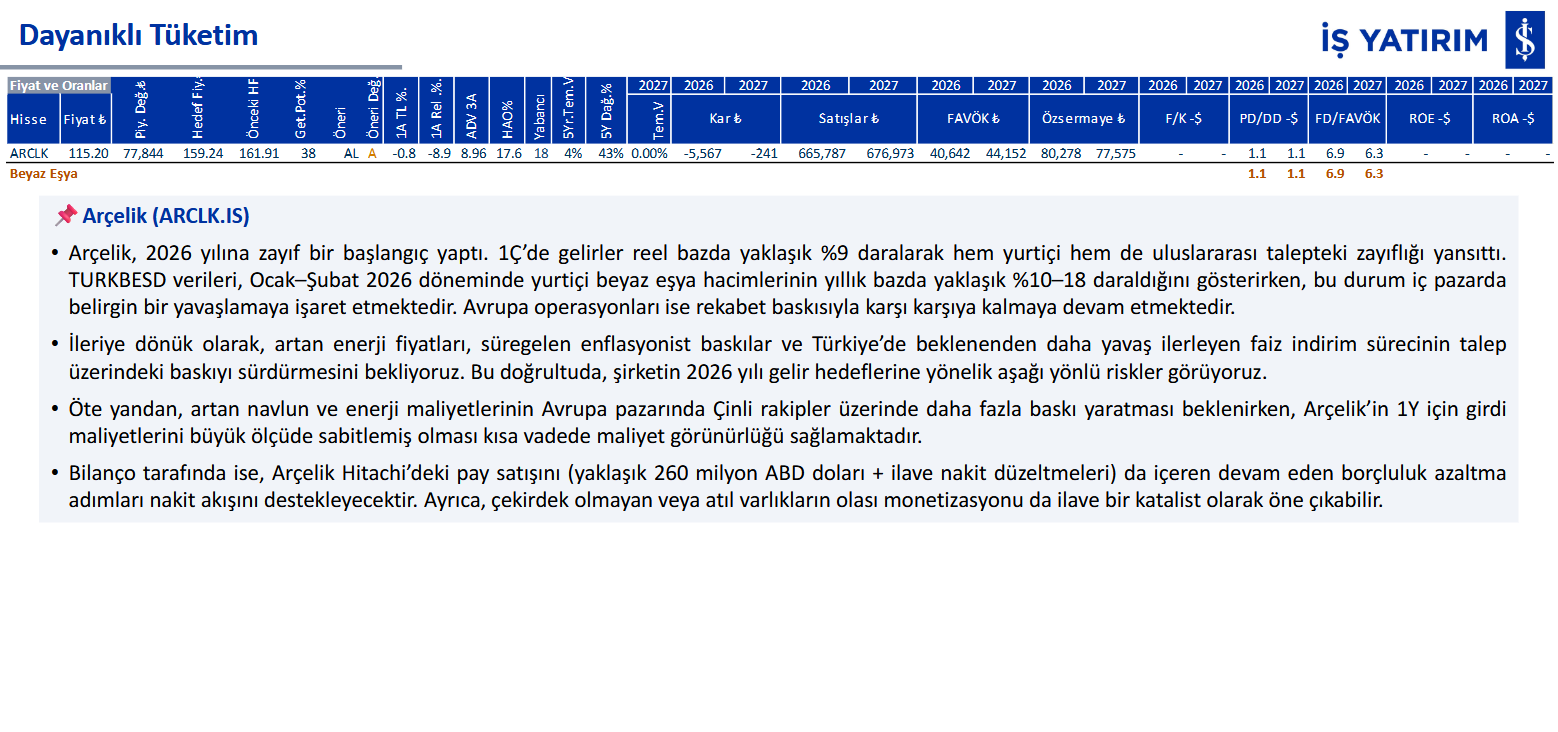 Arçelik (ARCLK) için İş Yatırım’ın raporunda, 2026 yılına zayıf bir başlangıç yapıldığı ve hem yurtiçi hem de uluslararası pazarlarda talep koşullarının baskı altında kaldığı belirtilmiştir. Şirketin gelirleri yılın ilk çeyreğinde reel bazda yaklaşık %9 daralmıştır. Avrupa operasyonlarında süren rekabet baskısı ve Türkiye’de faiz indirim sürecinin beklenenden yavaş ilerlemesi, talep görünümünü sınırlayan temel faktörler olarak öne çıkmaktadır.