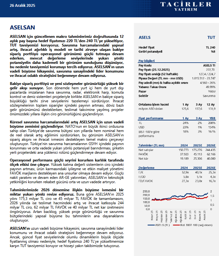 Tacirler Yatırım, ASELS - ASELSAN için hedef fiyatını 220 TL'den 240 TL'ye yükseltti, tavsiyesini 'TUT' olarak korudu