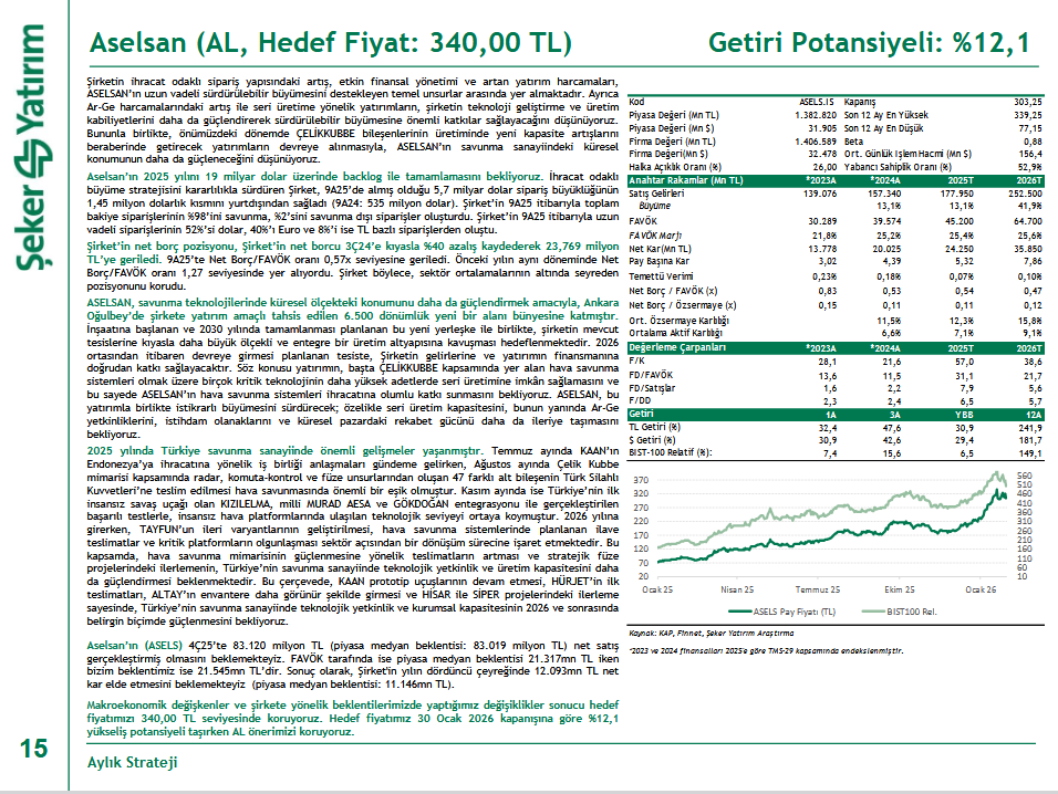 Şeker Yatırım, ASELS - Aselsan için hedef fiyatını 340 TL, tavsiyesini ise 'AL' olarak korudu.