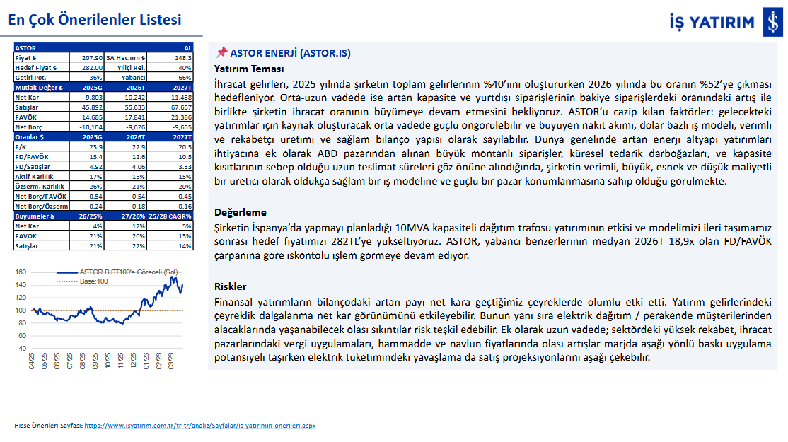 İş Yatırım, ASTOR - ASTOR ENERJI için hedef fiyatını 261.16 TL'den 282 TL'ye yükseltti, tavsiyesini AL olarak korudu.