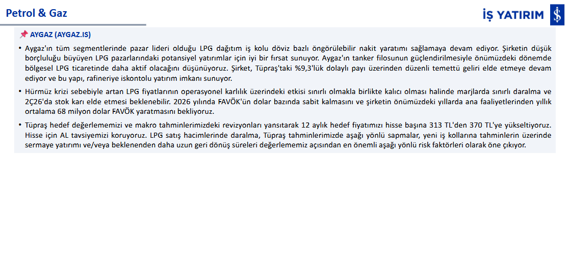 Rapor, Tüpraş değerlemesi ve makro varsayım güncellemeleri doğrultusunda hedef fiyatı 313 TL’den 370 TL’ye yükseltmiştir. Aşağı yönlü riskler arasında ana faaliyet dışı yatırımların artması ve LPG satış hacimlerinde beklenenden hızlı daralma yer almaktadır. Genel olarak Aygaz, güçlü bilançosu, temettü geliri ve istikrarlı kârlılığı nedeniyle “AL” tavsiyesiyle öne çıkarılmaktadır.