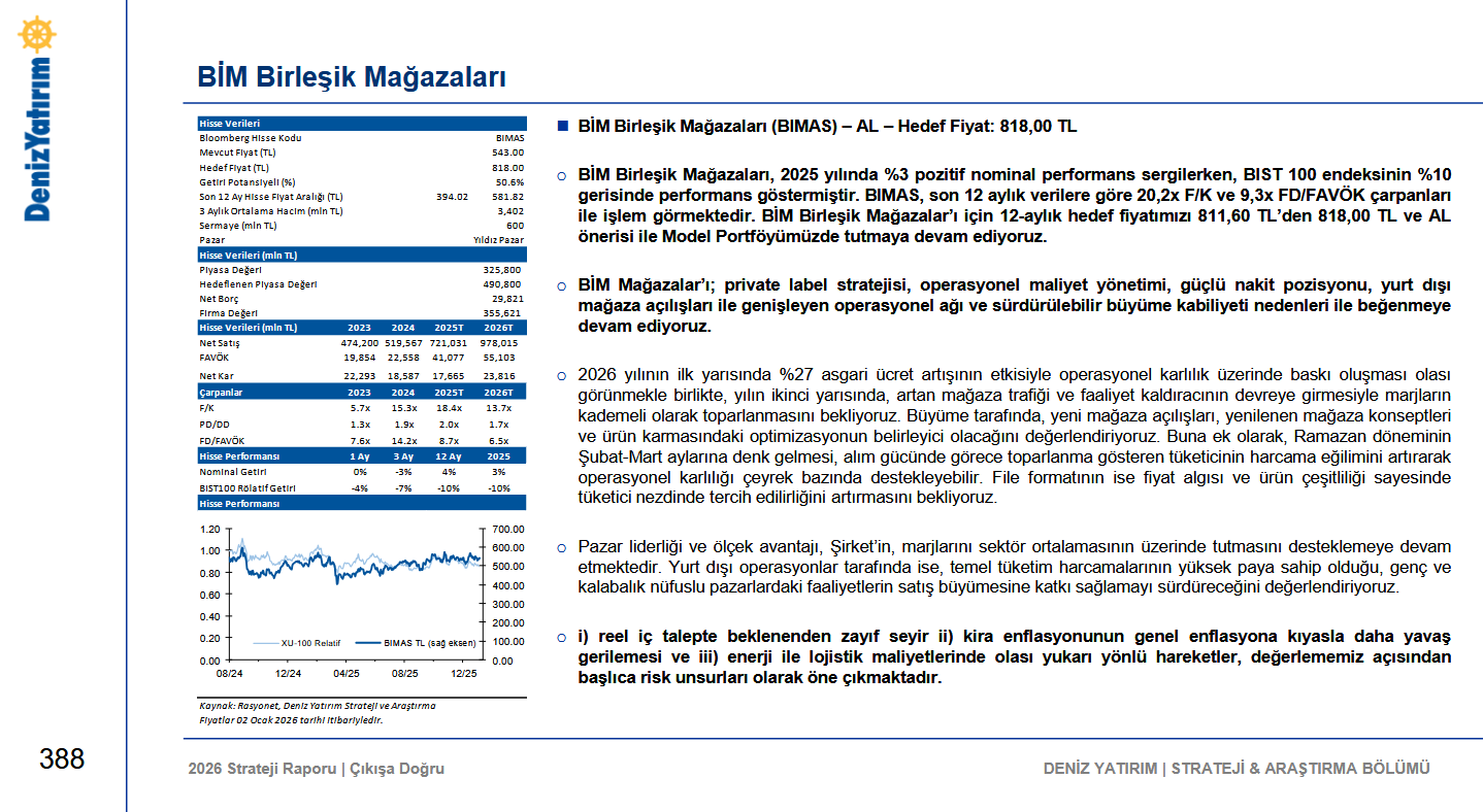 Deniz Yatırım, BIMAS - BİM için hedef fiyatını 811,6 TL'den 818 TL'ye yükseltti, tavsiyesini "al" olarak korudu