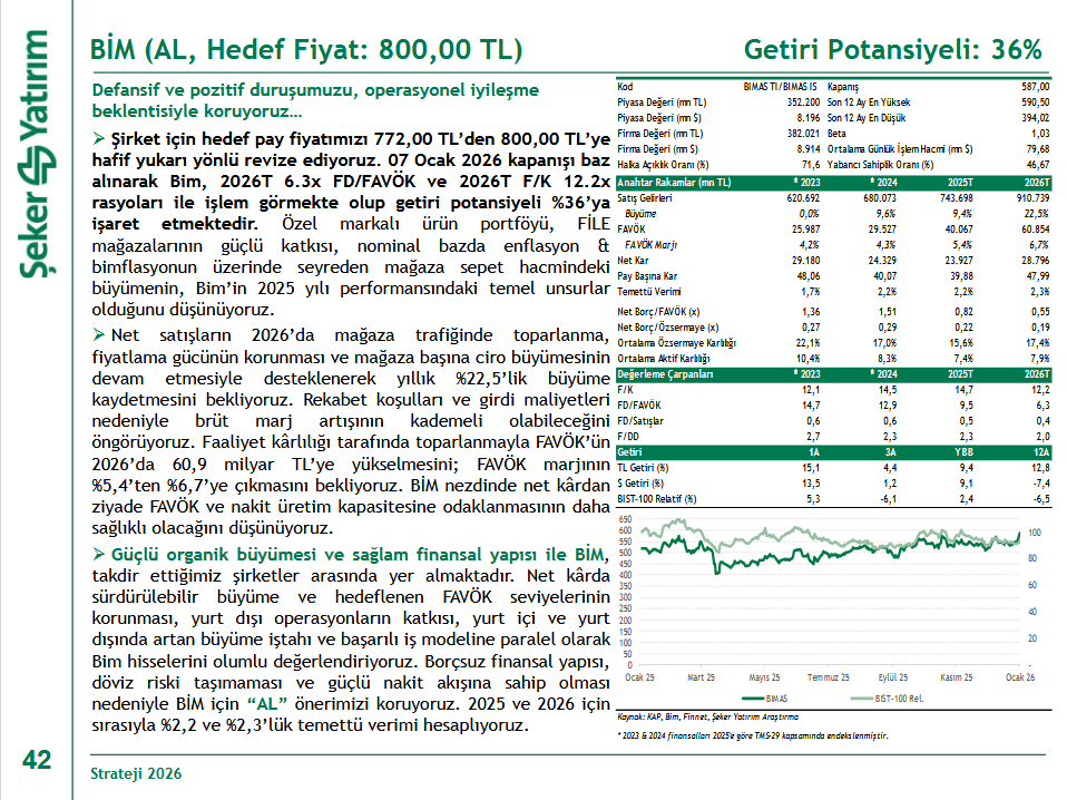 Şeker Yatırım, BIMAS - BİM için hedef fiyatını 765,186 TL'den 800 TL'ye yükseltti, tavsiyesini 'AL' olarak korudu.