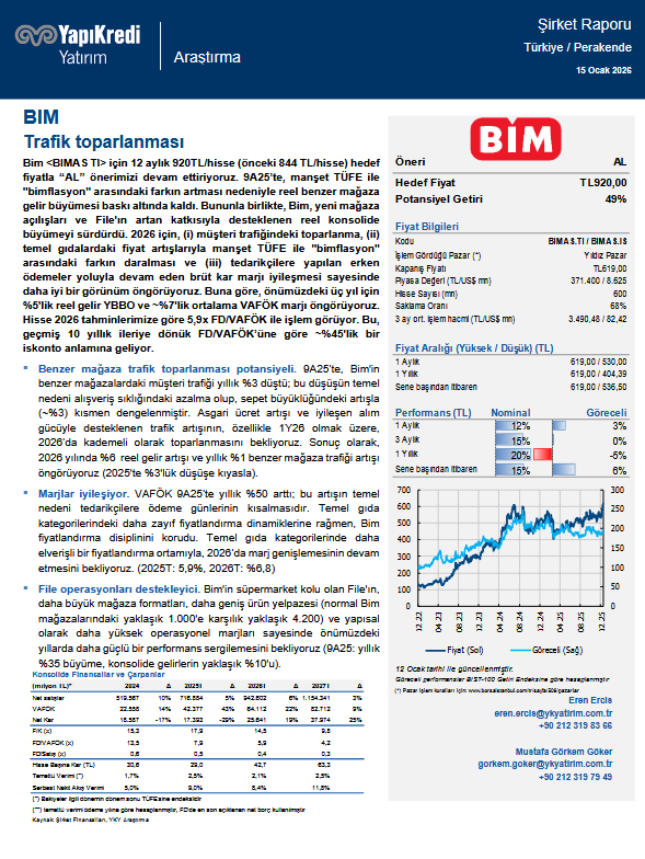 Yapı Kredi Yatırım, BIMAS - BİM için hedef fiyatını 844 TL'den 920 TL'ye yükseltti, tavsiyesini 'AL' olarak korudu