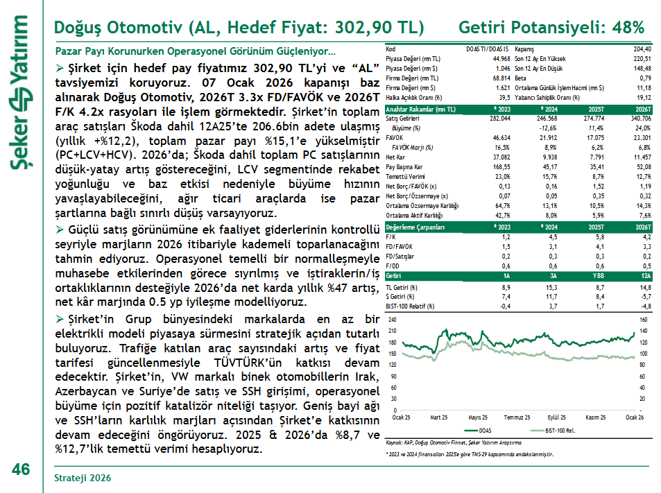 Şeker Yatırım, DOAS-Doğuş Otomotiv için hedef fiyatını 259,9 TL'den 302,9 TL'ye yükseltti, tavsiyesini 'AL' olarak korudu
