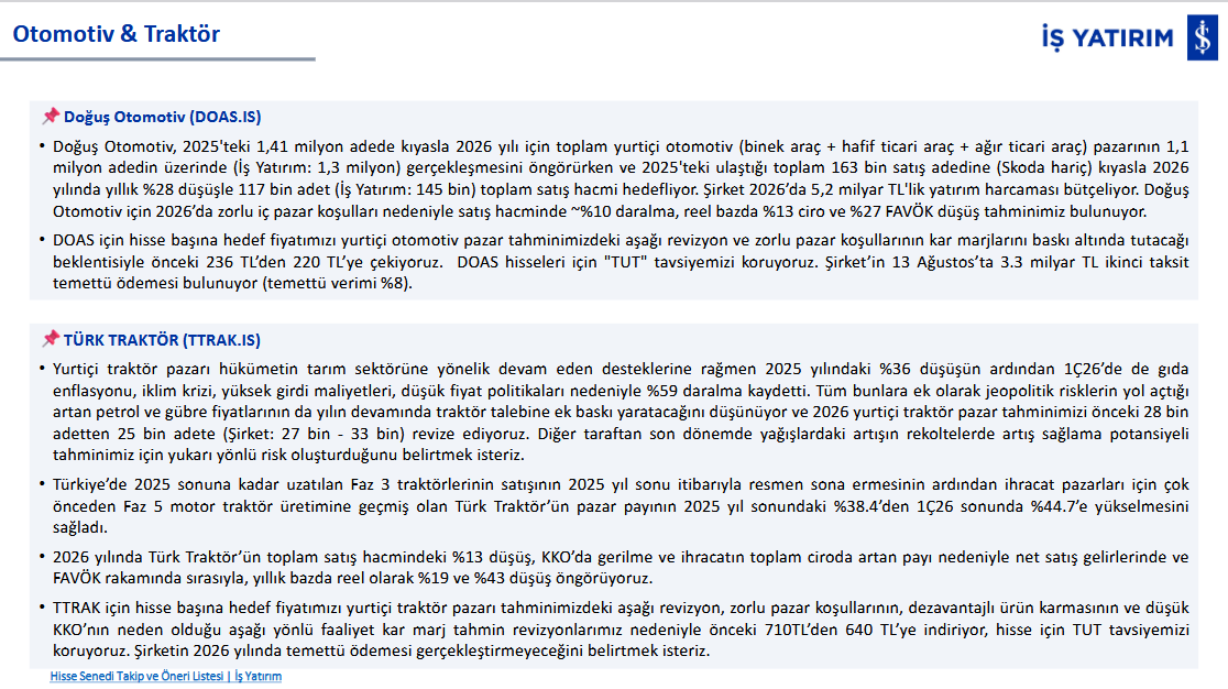 İş Yatırım, TUT tavsiyesini temel olarak mevcut kısa vadeli yavaşlamayla desteklemekte, bir kataliste ihtiyaç duyulduğunu ima etmektedir. Taşıt kiralama, lojistik ve finansal hizmet gibi yan iş kollarındaki çeşitlilik uzun vadeli değer yaratım potansiyeline işaret etmektedir. Riskler iç piyasada otomobil talebinin faiz oranına olan duyarlı yapısı ve ithal araçlardaki kur artışının satış adetlerine olan olumsuz etkisinden kaynaklanmaktadır.