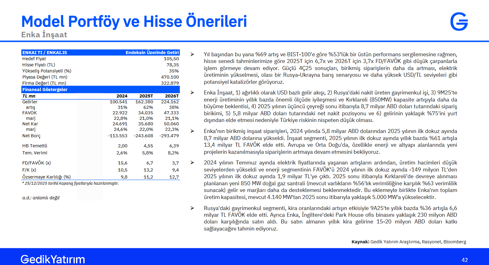 Gedik Yatırım, ENKAI-ENKA İnşaat için hedef fiyatını 105,5 TL, tavsiyesini "endeks üstü getiri" olarak korudu