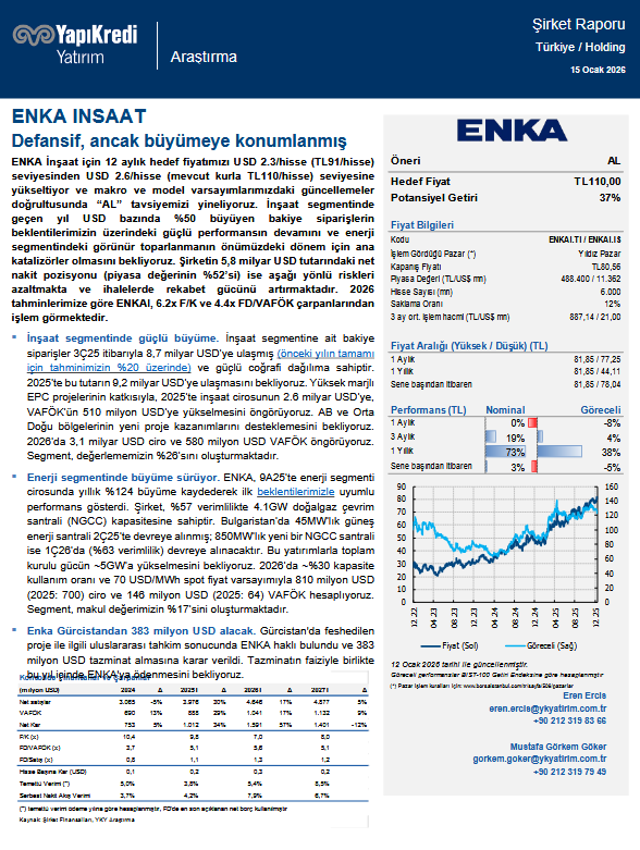 ENKA İnşaat için 12 aylık hedef fiyatımızı USD 2.3/hisse (TL91/hisse) seviyesinden USD 2.6/hisse (mevcut kurla TL110/hisse) seviyesine yükseltiyor ve makro ve model varsayımlarımızdaki güncellemeler doğrultusunda “AL” tavsiyemizi yineliyoruz.