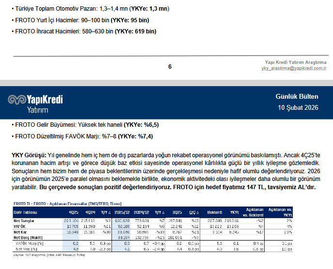 FROTO, 4Ç25’te 10,6 milyar TL net kâr açıklayarak hem kurum beklentisi (8,2 milyar TL) hem de piyasa beklentisinin (9,1 milyar TL) üzerinde performans gösterdi. Operasyonel kârlılık, maliyetlerdeki iyileşme ve brüt marjdaki artışla desteklendi. Brüt kâr marjı yıllık 1,1 puan artışla %8,3, FAVÖK 13,7 milyar TL ve FAVÖK marjı %6,2 seviyesinde gerçekleşti. Operasyonel performanstaki iyileşme ile net borç/FAVÖK rasyosu 2,5x’ten 1,9x’e geriledi.