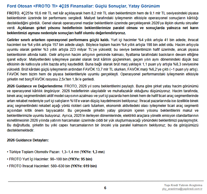 2026 yılı için şirket yatay hacim ve operasyonel kârlılık öngörüyor. Yurt içi satışların artan rekabet nedeniyle %18’e varan düşüş gösterebileceği, ihracat tarafında ise ekonomik aktivite iyileşmelerinin ticari araç segmentinde kritik olacağı belirtiliyor. Capex harcamalarının 2025 seviyesinde kalması bekleniyor.