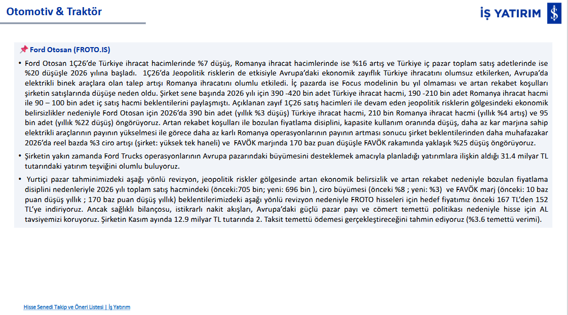 Hem fiyatlama disiplininin bozulması hem de elektrikli araçlar ile Romanya üretiminin kâr marjı üzerindeki baskı, 2026 reel bazda ciro artışının tek haneli kalmasına ve faaliyet kâr marjının 170 baz puan daralarak %25 civarına gerilemesine yol açmaktadır. Buna karşılık Ford Trucks'ın Avro ihracat pazarını desteklemeye yönelik 31.4 milyar TL'lik pozitif etkiyi analistler olumlu bulmaktadır. Hisse için hedef fiyat yukarıda bahsedilen revizyon gerekçesiyle 167 TL'den 152.50 TL'ye indirilmiştir.