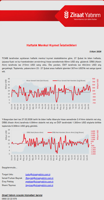 TCMB tarafından açıklanan haftalık menkul kıymet istatistiklerine göre, 27 Şubat ile biten haftada piyasa fiyatı ve kur hareketlerinden arındırılmış verilere göre hisse senetlerinde 65 milyon dolar alış gerçekleşti. DİBS (kesin alım) tarafında ise 213 milyon dolar satış görüldü. Öte yandan ÖST tarafında 454,5 milyon dolarlık alış gerçekleşti. Toplamda yabancıların 23–27 Şubat haftasındaki işlemleri 307 milyon dolarlık net satışa işaret etti.