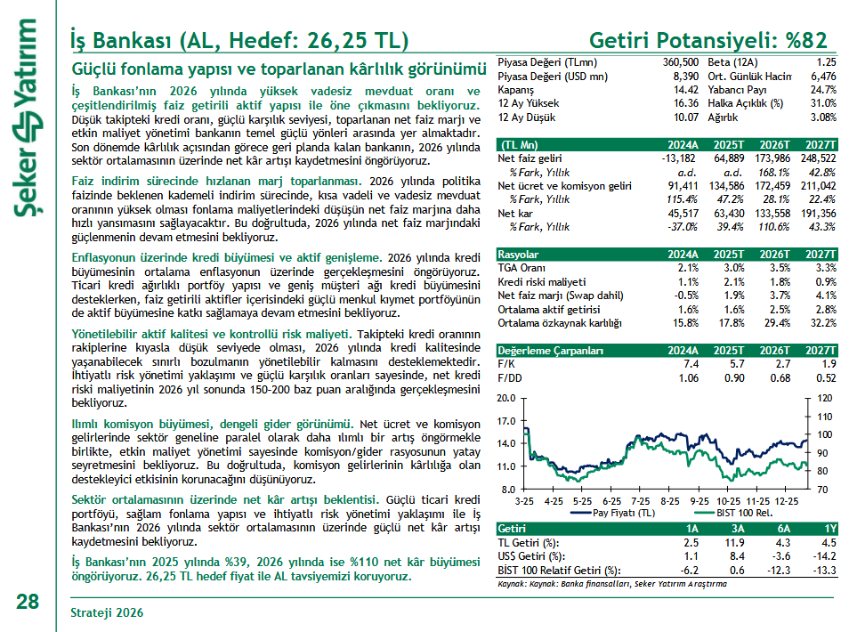 Şeker Yatırım, ISCTR - İş Bankası (C) için hedef fiyatını 26.25 TL hedef fiyat ile 'AL' tavsiyesini korudu.