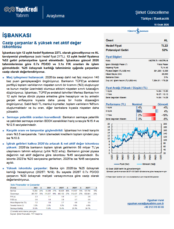 Yapı Kredi Yatırım, ISCTR - İş Bankası C için hedef fiyatını 21 TL'den 22 TL'ye yükseltti, tavsiyesini ise 'AL' olarak korudu.