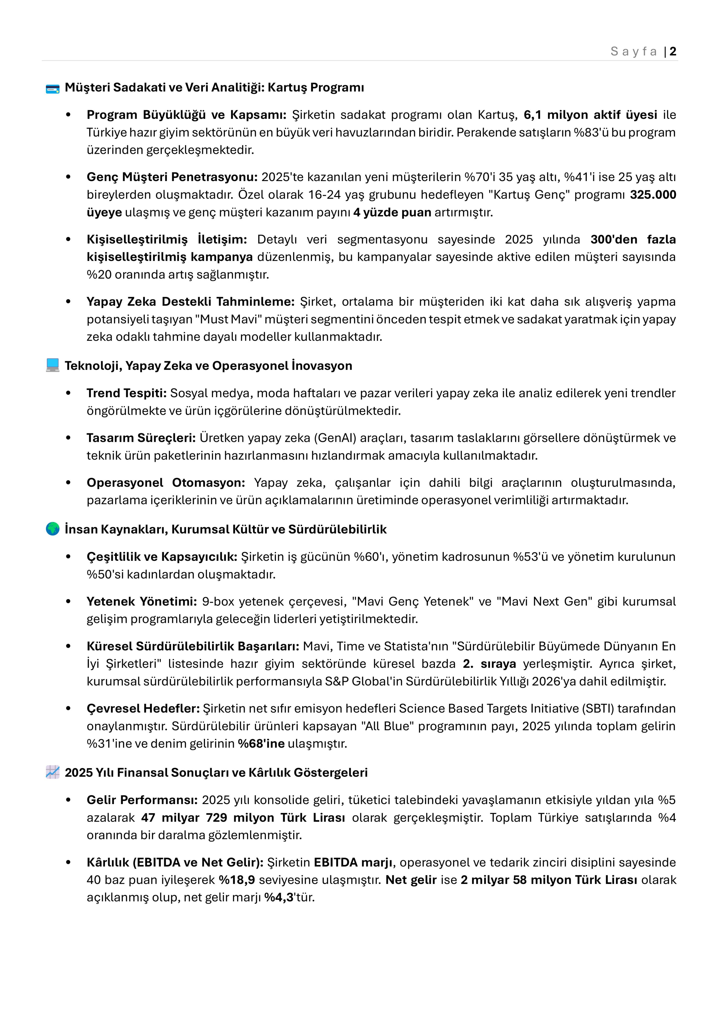 Mavi Giyim 2025 yılında zorlu makro koşullara rağmen operasyonel disiplinini koruyarak güçlü bir kârlılık performansı sergilemiştir. Konsolide gelir yıllık %5 daralarak yaklaşık 47,7 milyar TL’ye gerilerken, EBITDA marjı %18,9’a yükselmiş, net kâr ise 2,06 milyar TL seviyesinde gerçekleşmiştir. Enflasyon muhasebesinin kaldırılmasının 424 milyon TL’lik tek seferlik negatif etkisi bulunmasına rağmen düzeltilmiş net kârlılık daha yüksek seviyededir. Brüt marj %51 ile güçlü kalmış, şirket temettü dağıtımı ve geri alım politikasıyla sermaye disiplinini sürdürmüştür.