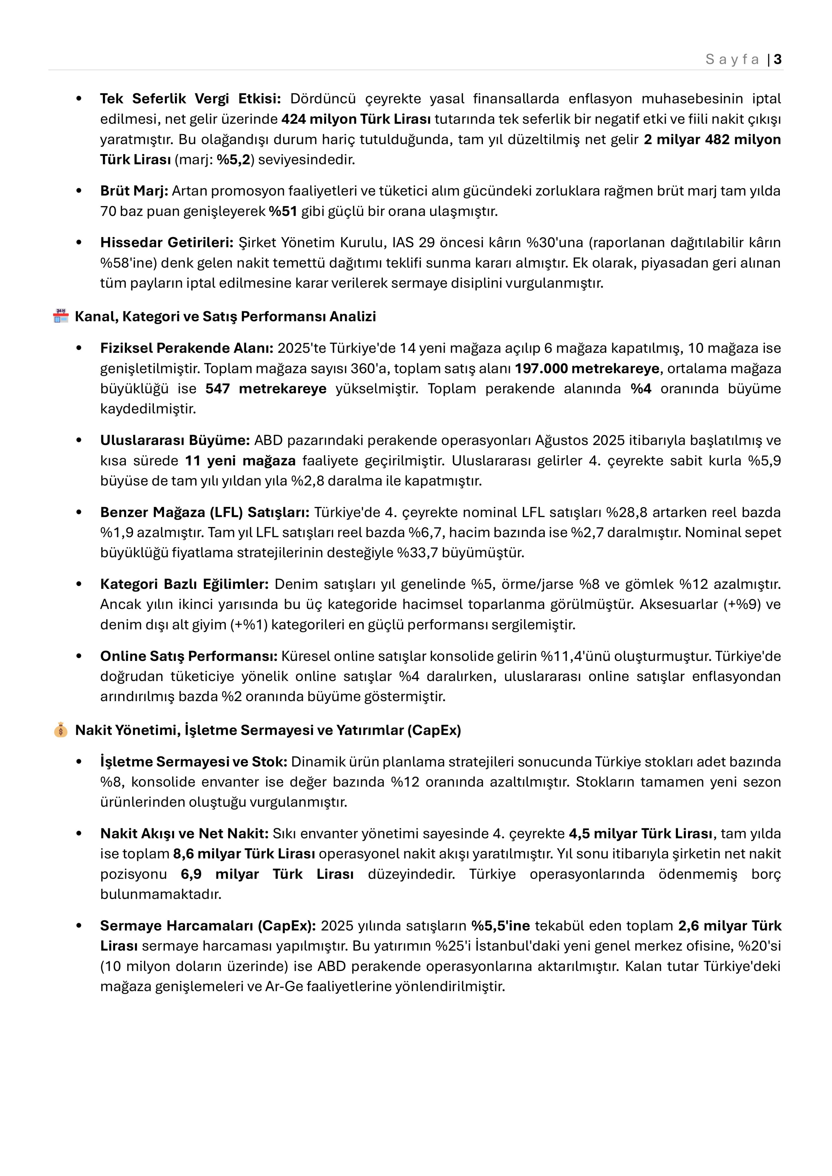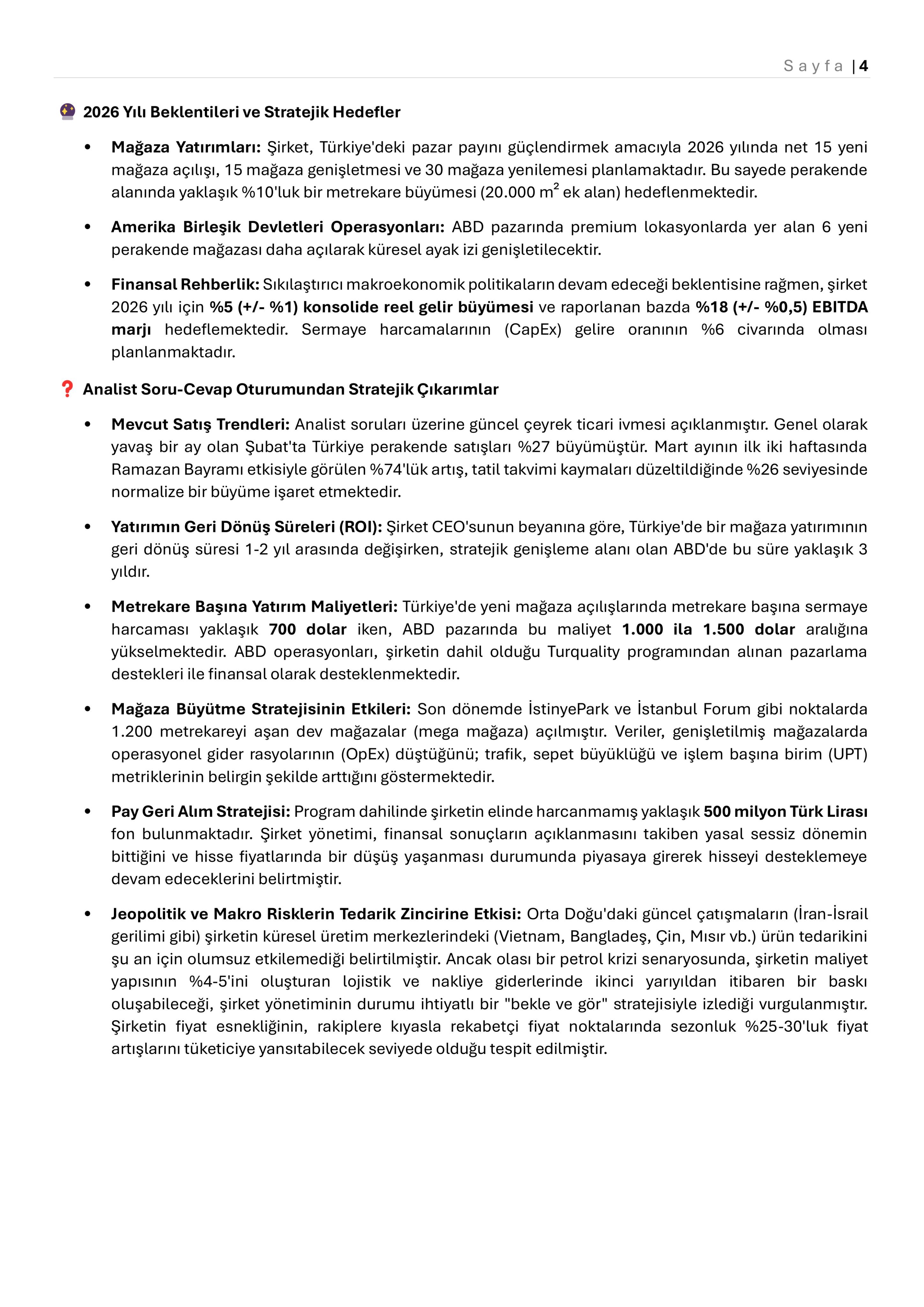 2026 beklentilerinde Türkiye’de mağaza büyümesi, ABD’de genişleme ve yaklaşık %5 reel gelir artışı hedeflenmektedir. EBITDA marjının %18 civarında korunması beklenmektedir. Mağaza yatırımlarında Türkiye’de geri dönüş süresi 1-2 yıl, ABD’de yaklaşık 3 yıl seviyesindedir. Şirketin fiyatlama gücü ve esnekliği korunmakta olup, olası maliyet baskılarına karşı “bekle-gör” yaklaşımı benimsenmektedir. Jeopolitik riskler şu an sınırlı etki yaratırken, enerji ve lojistik maliyetleri potansiyel risk unsuru olarak öne çıkmaktadır.