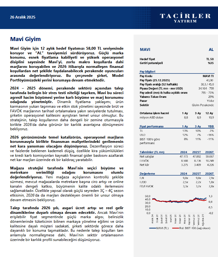 Tacirler Yatırım, MAVI - Mavi Giyim için hedef fiyatını 58 TL, tavsiyesini ise 'AL' olarak korudu.