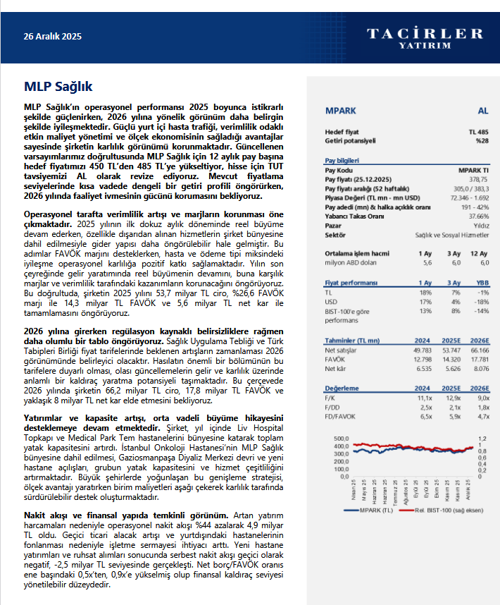 Tacirler Yatırım, MPARK - MLP Care için hedef fiyatını 450 TL'den 485 TL'ye, tavsiyesini ise 'TUT'tan 'AL'a yükseltti.