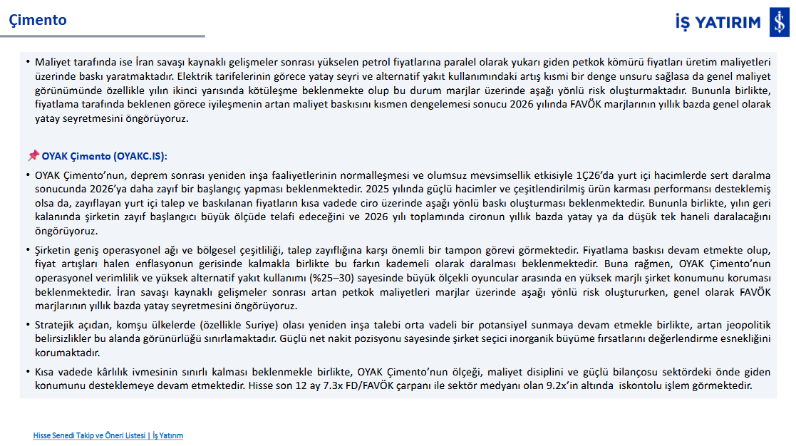 İş Yatırım, OYAK Çimento'nun maliyet disiplini ve alternatif yakıt kullanımındaki (%25-30 oranı) güçlü konumuyla sektördeki en verimli oyunculardan biri olarak konumlanacağını öngörmektedir. Stratejik olarak Suriye'nin yeniden yapılanması ile ilgili beklentiler orta vadeli bir büyüme potansiyeli sunmakla birlikte, jeopolitik belirsizlikler bu senaryoyu geciktirme riski taşımaktadır. Hisse son 12 aylık işleminde 7.3x FD/FAVÖK ile sektörün medyanına göre iskontolu konumda işlem görmektedir.