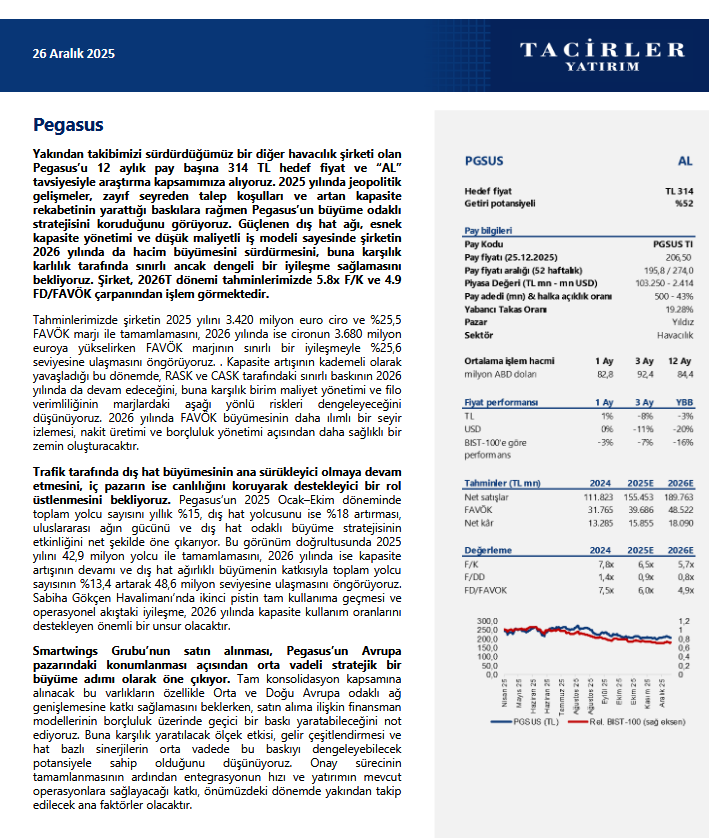 Tacirler Yatırım, PGSUS - Pegasus’u 12 aylık 314 TL hedef fiyat ve “AL” tavsiyesiyle araştırma kapsamına aldı.