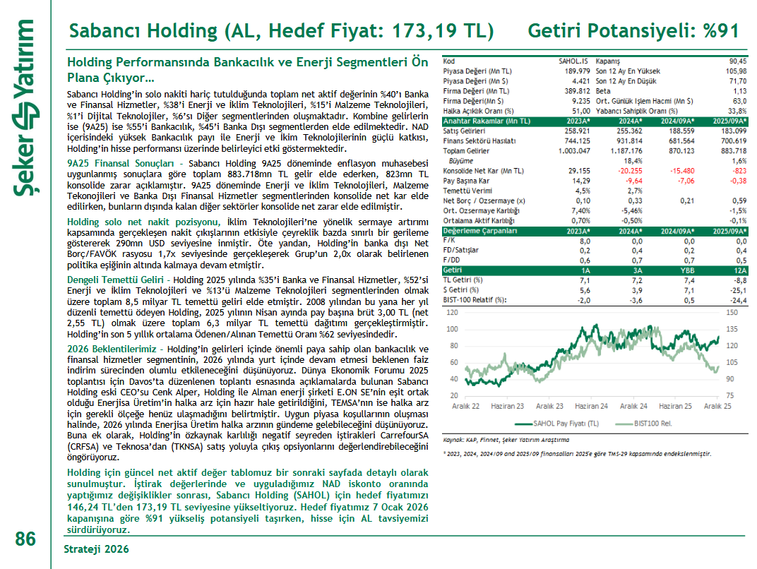 Şeker Yatırım, SAHOL - Sabancı Holding için hedef fiyatını 146,24 TL'den 173,19 TL'ye yükseltti, tavsiyesini 'AL' olarak korudu.