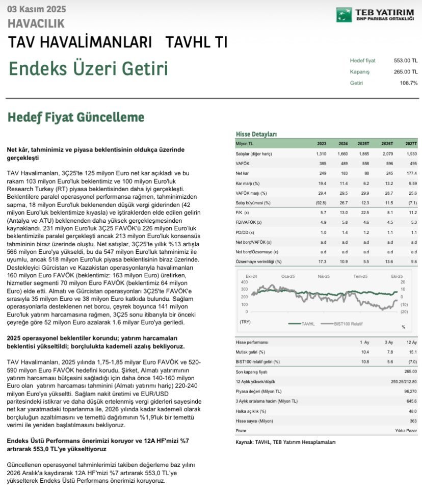TEB Yatırım, TAVHL - TAV Havalimanları için hedef fiyatını 518,62 TL'den 553, TL'ye yükseltti, tavsiyesini "endeks üstü getiri" olarak korudu