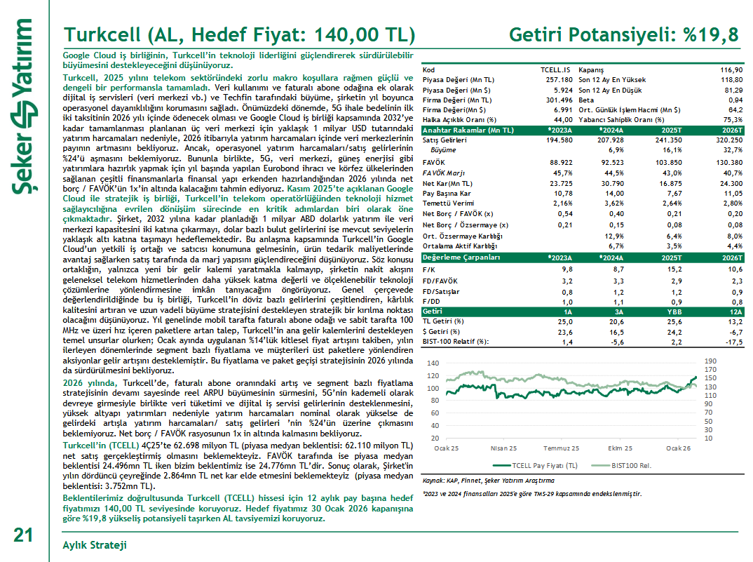Turkcell’in 4Ç25’te 62.698 milyon TL net satış ve 24.776 milyon TL FAVÖK elde etmesi, net karının ise 2.864 milyon TL civarında gerçekleşmesi beklenmektedir. Bu çerçevede, Turkcell hissesi için 12 aylık hedef fiyat 140,00 TL olarak korunmakta ve %19,8 yükseliş potansiyeli ile “AL” tavsiyesi sürdürülmektedir.