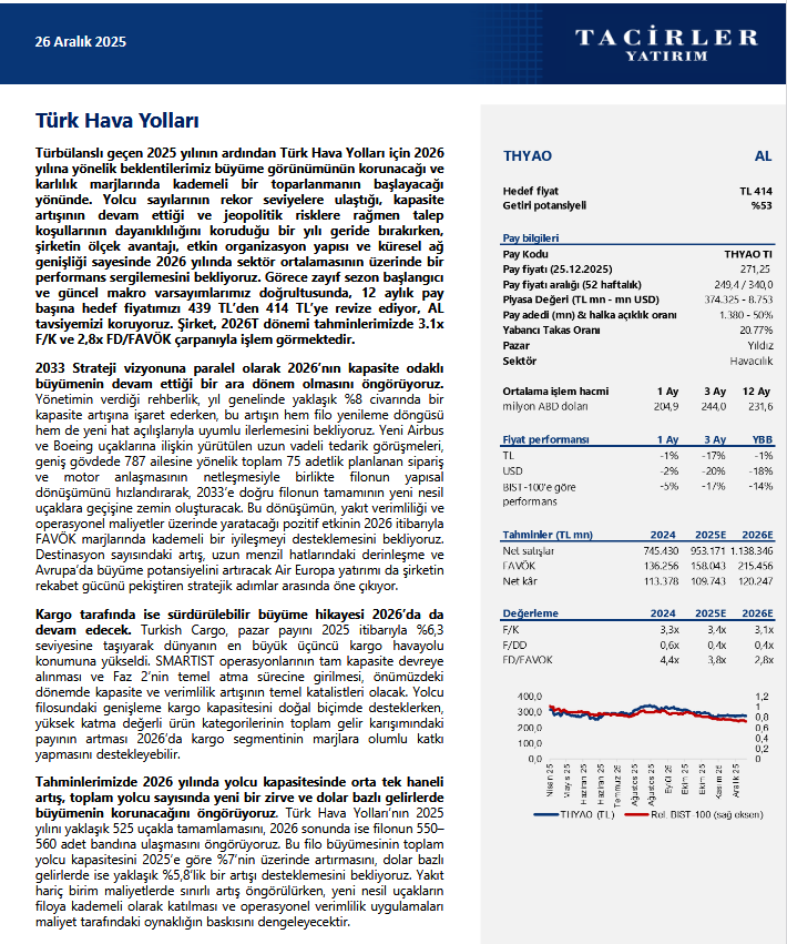 Tacirler Yatırım, THYAO - THY için hedef fiyatını 439 TL’den 414 TL’ye revize ederken tavsiyesini ise 'AL' olarak sürdürdü.