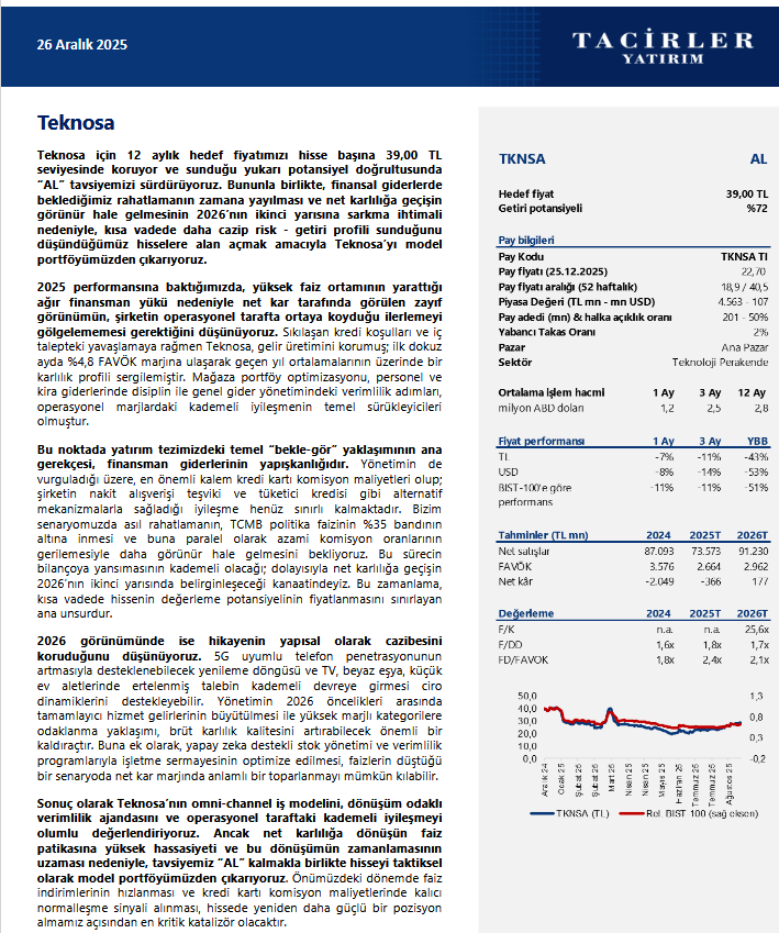 Tacirler Yatırım, TKNSA - Teknosa için hedef fiyatını 39.0 TL, tavsiyesini ise 'AL' olarak korudu.