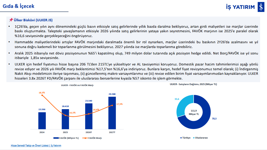 Ülker için İş Yatırım’ın raporunda temel yatırım tezi, 2026 yılında güçlü baz etkisi nedeniyle satışların yataya yakın seyretmesi ve artan hammadde maliyetleri sebebiyle FAVÖK marjında baskı oluşması üzerine kuruludur. Şirketin satışlarının 2026’da genel olarak yatay kalması, FAVÖK marjının ise yaklaşık %16,6 seviyesinde, 2025’e paralel gerçekleşmesi beklenmektedir. Yılın ilk yarısında maliyet baskılarının daha belirgin olduğu, ikinci yarıda ise bu baskının hafiflemesi ve 2027’ye doğru kademeli bir toparlanma yaşanabileceği öngörülmektedir.